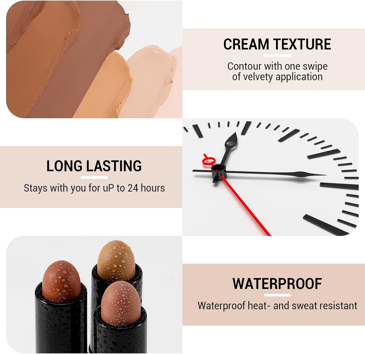 【LONG-LASTING & WATERPRROF】:sweat-proof waterproof cream contour stick can create a makeup that lasts up to 24 hours even when it’s hot or raining.