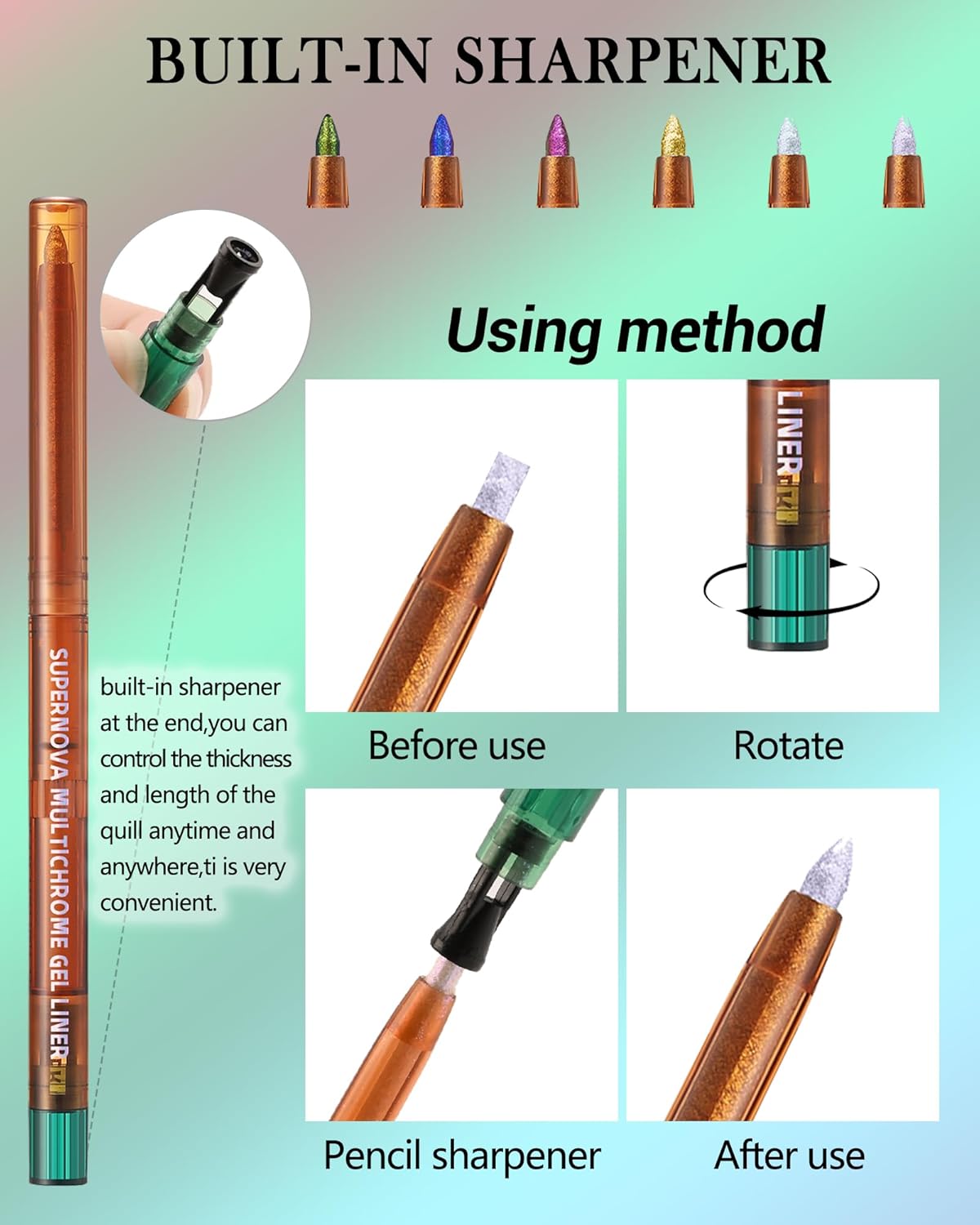 Multi-Purpose-This is a multi-purpose eye makeup product, you can use it as an eyeliner or an eye shadow, and the unique highly pigmented mixture can change colors according to the angle of light, bringing you a rainbow eye makeup effect.