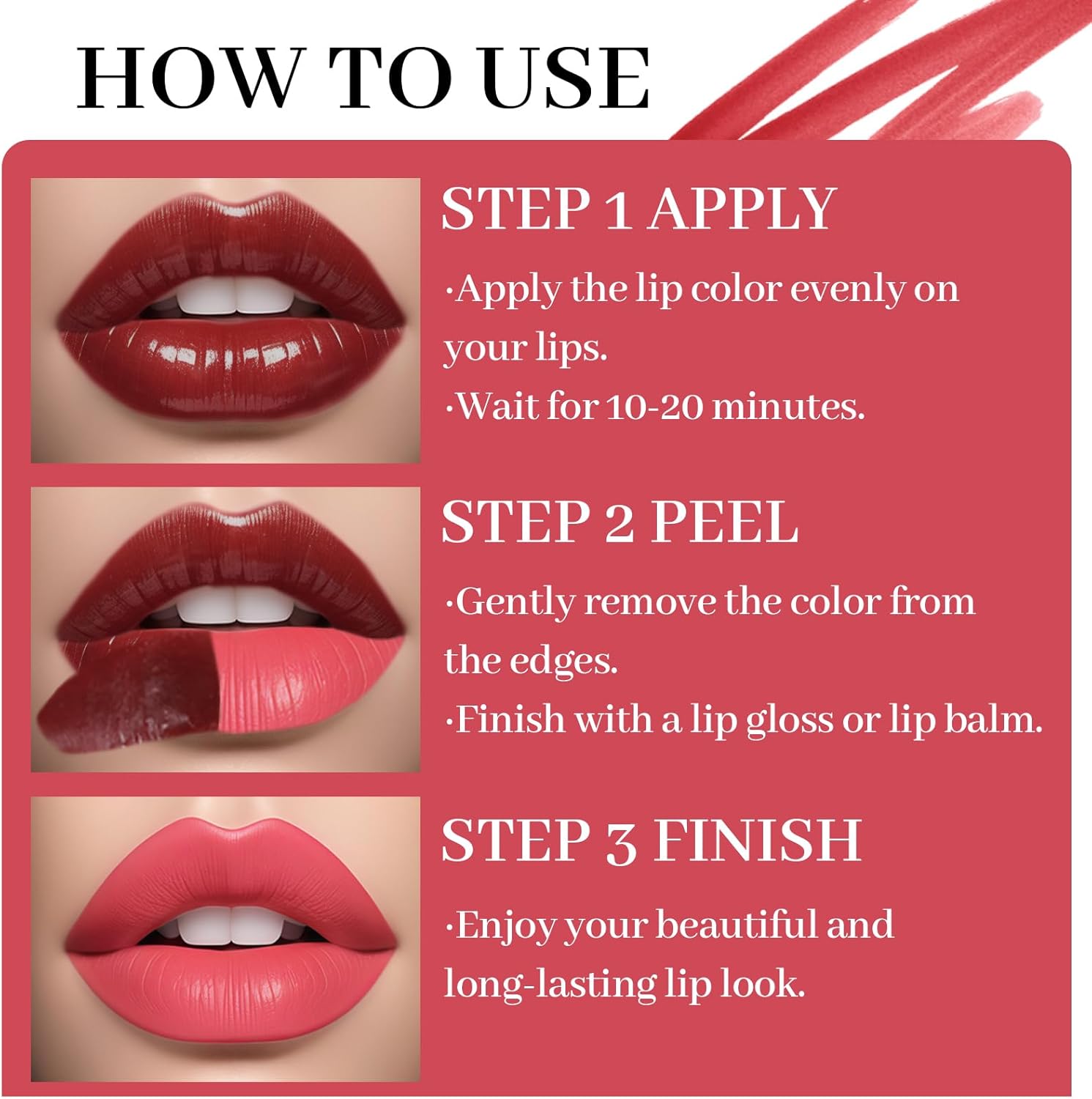 Peel Off: Once fully dry, carefully peel off the film starting from the edge of your lips to reveal the vibrant stain.