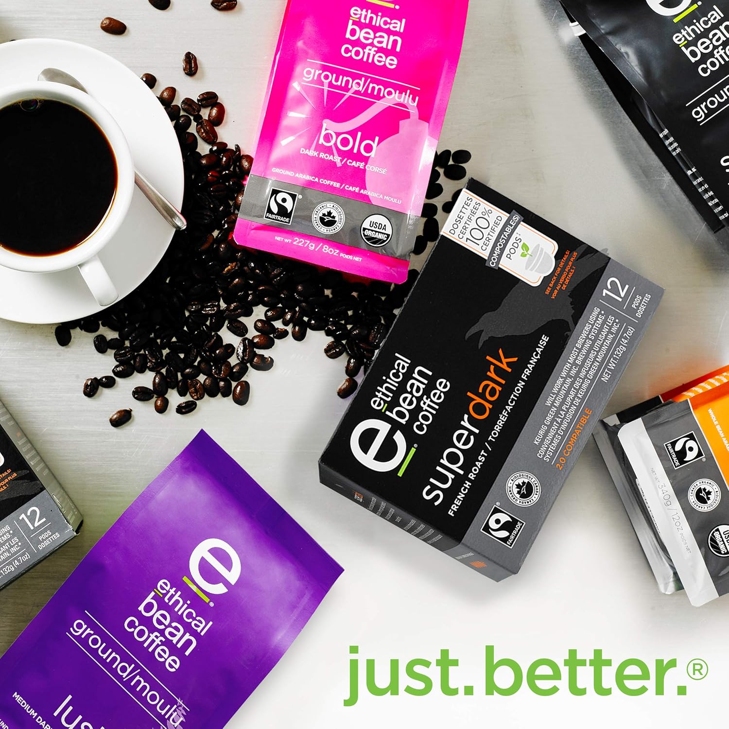 Convenience meets sustainability and taste with Ethical Bean Coffee’s 100-Percent compostable pods. Made from coffee bean chaff and other renewable materials, the entire k-cup can be thrown directly into the compost bin. The innovative pods are BPI certified and tests in municipal composting show they can break down in as few as five weeks– faster than many other kinds of common food waste. Compatible with most Keurig 1.0 and 2.0 brewers. Fairtrade and Organic Certified.Premium Arabica beans roasted to perfection. Superdark French Roast. The love child of dark alchemy and complete combustion. A hammering dark roast, blended to display body, balance and a dazzling dark cocoa-laced finish.Ethical Bean Coffee is a proud founding Canadian Certified B Corporation.