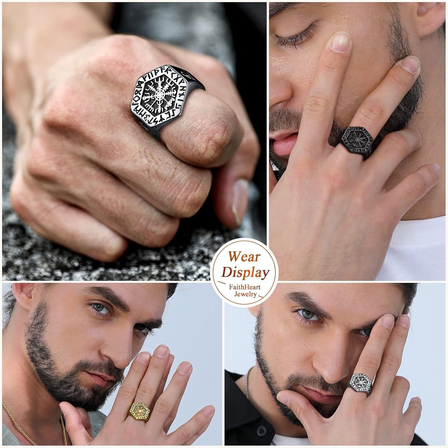 FaithHeart Viking Vegvisir Pirate Compass Rings, Stainless Steel/18K Gold Plated Norse Symbol Vintage Jewelry Personalized Custom