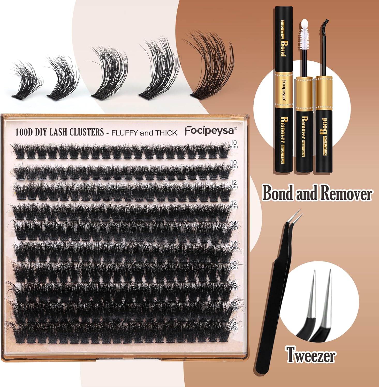 【DIY Cluster Extension Kit-Formulated to be mild and long lasting】: Focipeysa lash bond and remover combines lash adhesive glue and lash remover to remove lash glue. The professional and gentle eyelash adhesive glue and remover formula makes the fluffy clusters lashes waterproof and long lasting and quick to remove. DIY lash kit with 200pcs premium quality eyelash clusters extension 100D 10-18mm mixed, make DIY cluster eyelash extensions anytime.