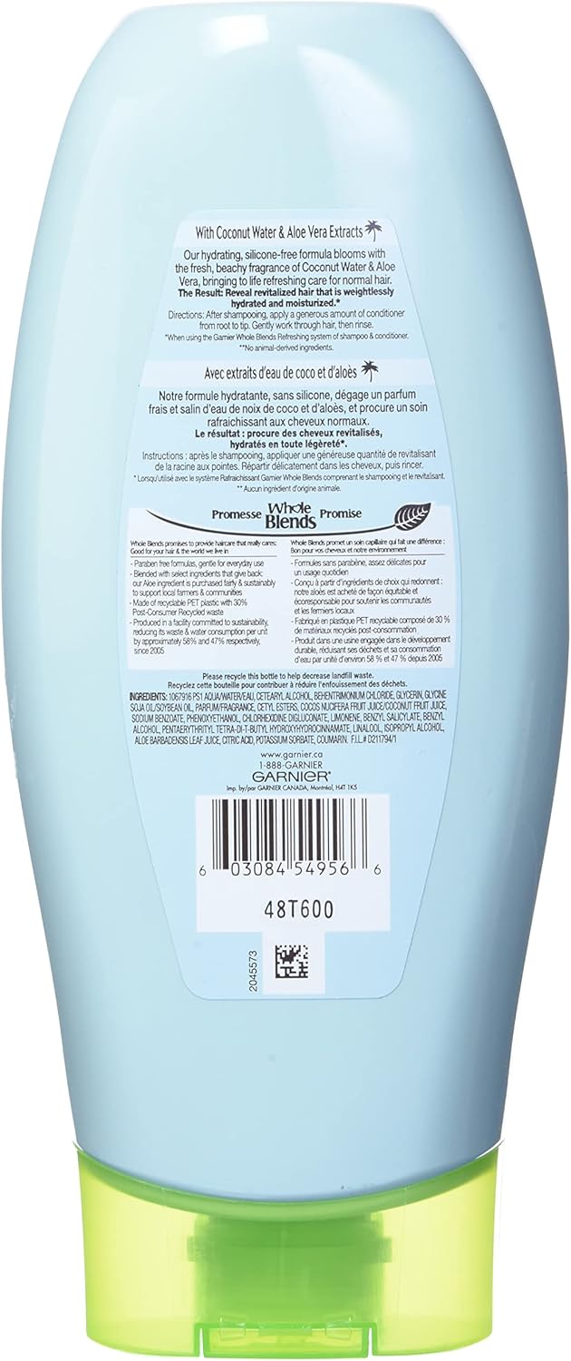 Our hydrating, silicone-free formula blooms with the fresh, beachy fragrance of coconut water & Aloe Vera, bringing to life our wholesome, refreshing care for dry hair. When using the Garnier whole Blends refreshing system of shampoo & conditioner.