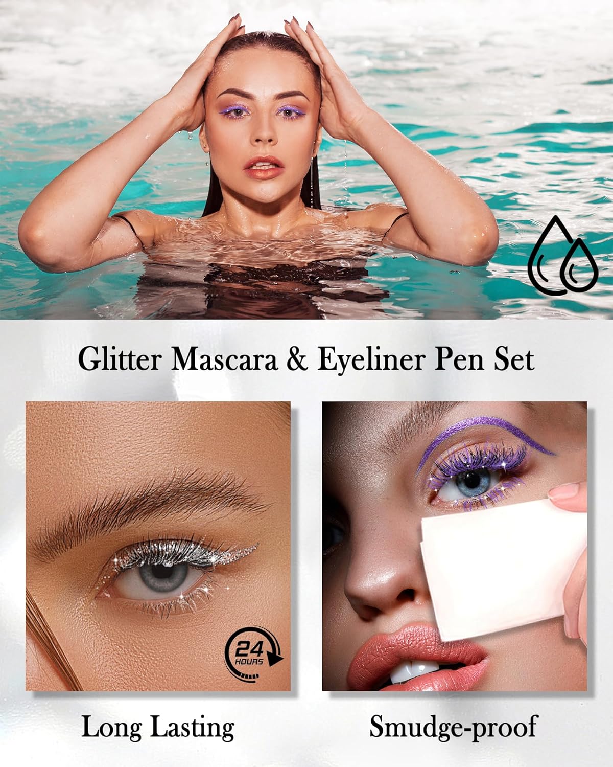 Colored Mascara & Eyeliner Makeup Duo – The set include mascara de pestañas and liquid eyeliner pen. Our diamond glitter mascara makes your lashes sparkle with a single brush. And our metallic eyeliner provides a shiny, reflective look. The elegant and radiant pearlescent offers a multi-angle glow in different light. This glitter eye combo will make you be center in the crowds.