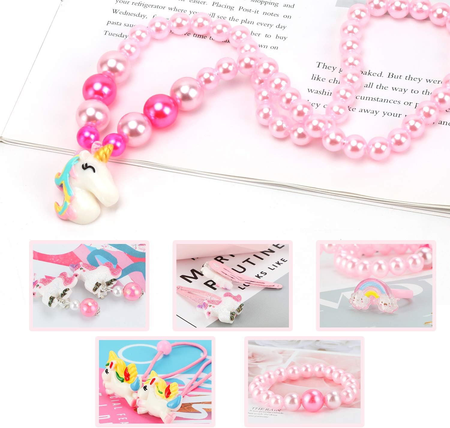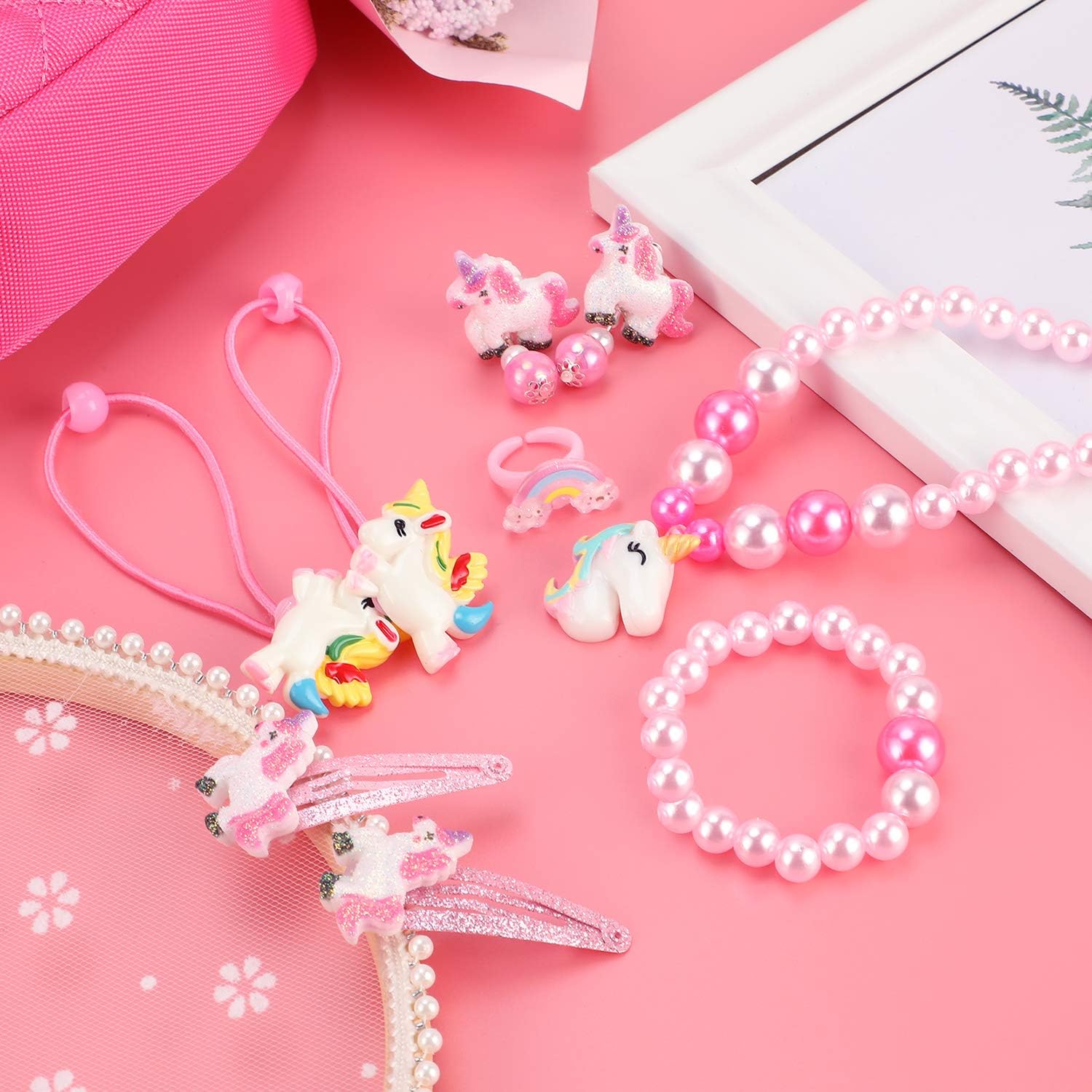 Package includes: 1 * Unicorn Handbag, 1 * Necklace, 1 * Bracelet, 1 * Ring, 1 * Earrings, 2 * Hair Clips, 2 * Rubber Band and lightweight beads of different sizes.