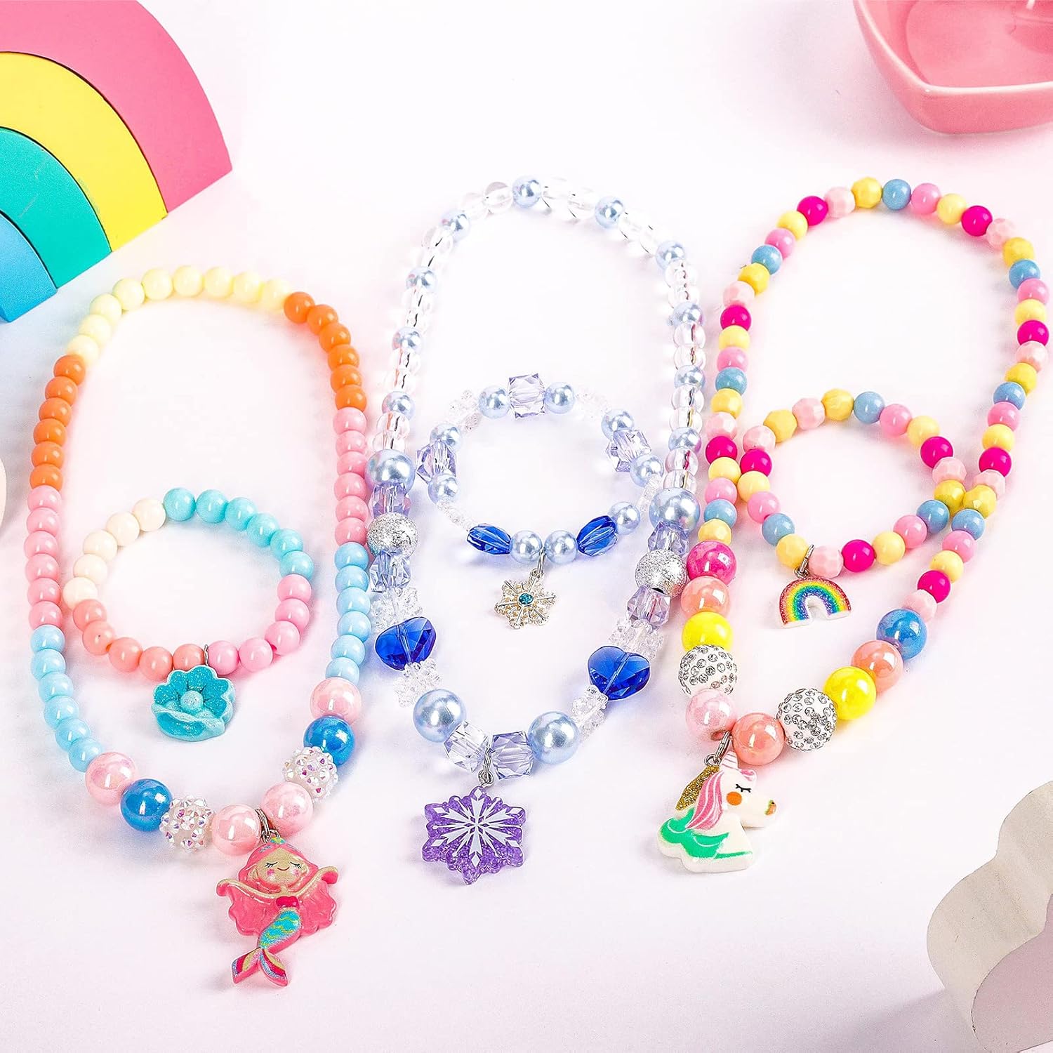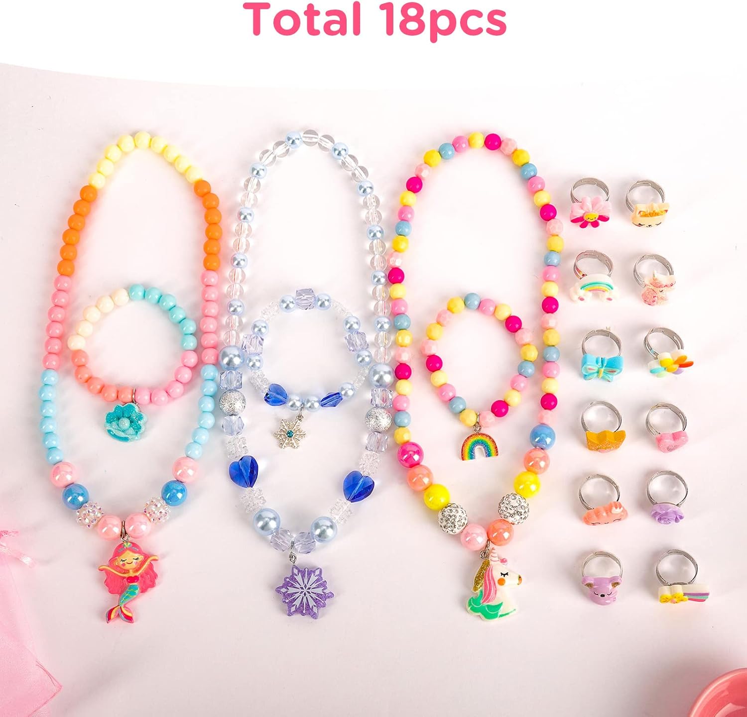 HiUnicorn 18PCS Girls Jewelry Princess Necklace Bracelets and Rings Gift Set for Kids, Beads Elastic Jewelry Unicorn Mermaid Snowflake Princess Dress-up Toys for Little Girl Age 4-7 Loot Bag Fillers