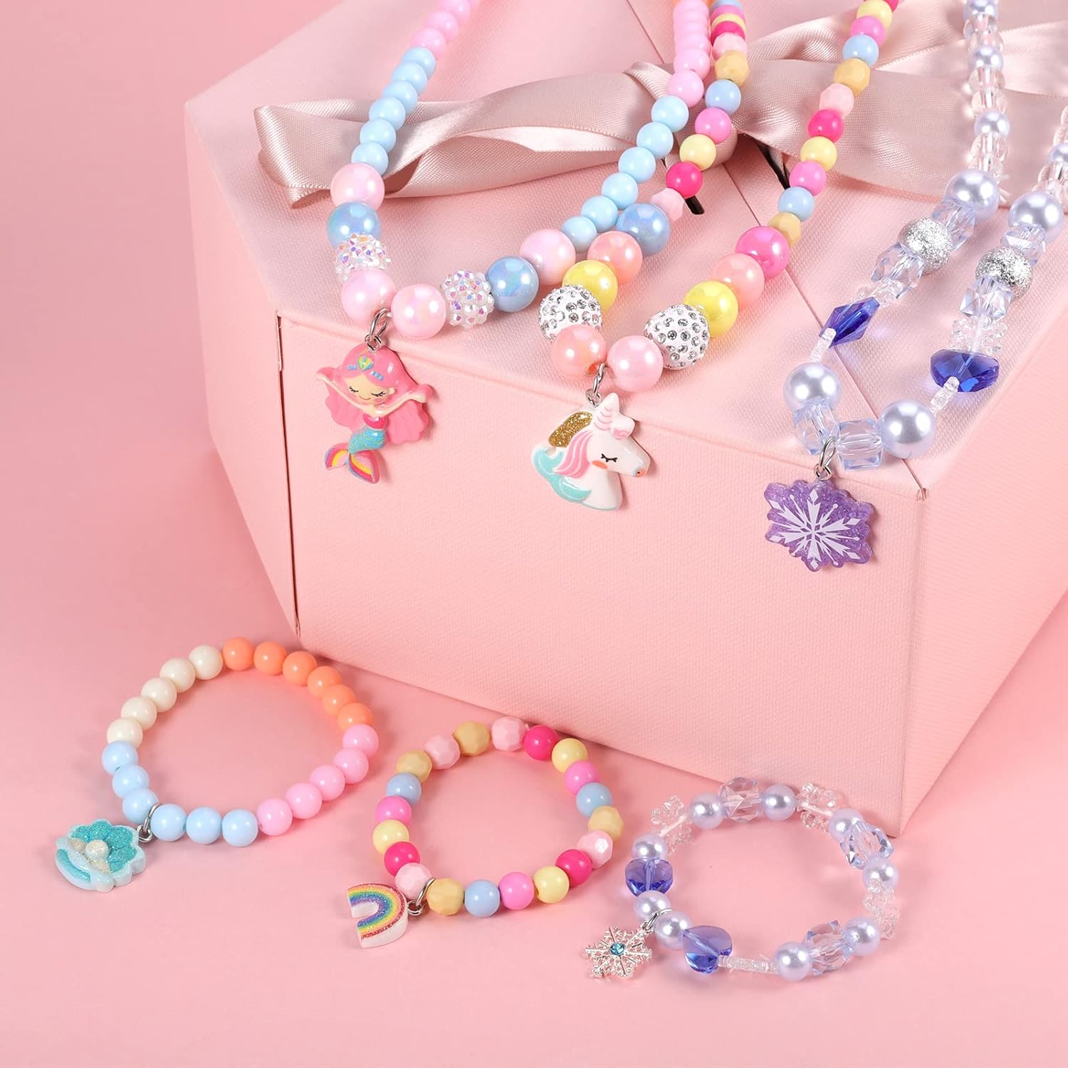 HiUnicorn Little Girls Jewelry Necklaces Bracelets Easter Egg Basket Filler Dress Up Play Elastic Chunky Beads with Princess Snowflake Unicorn Mermaid Glitter Charms
