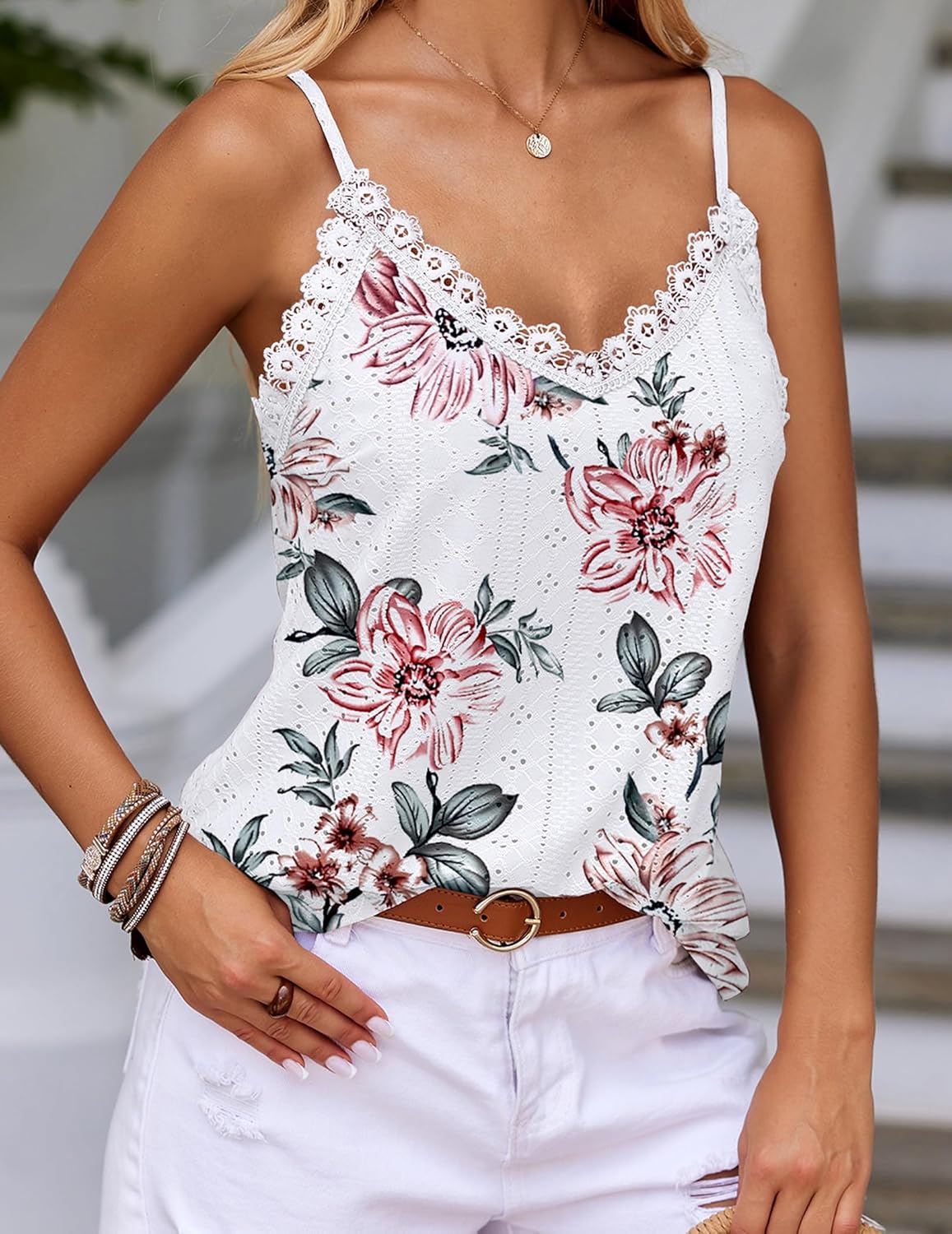 Hotouch Tank Tops for Women V Neck Lace Trim Cami Casual Cute Summer Top Loose Fit