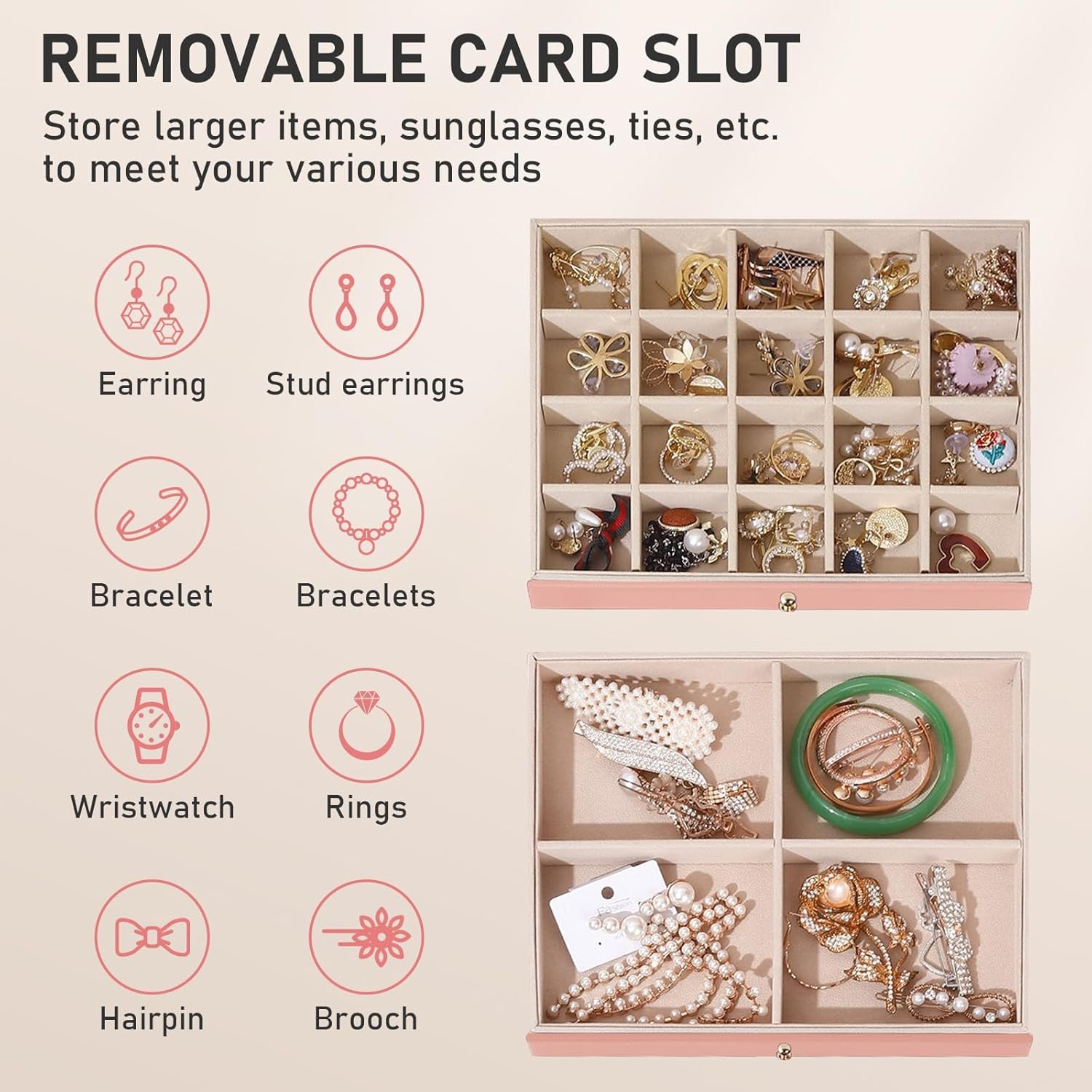【Drawer storage box】The two-layer jewelry storage compartments below are two different layouts, which can store your different jewelry separately to prevent them from colliding and entangled with each other. the baffle inside the compartment can be removed at will, and you can set up a more suitable layout according to your own needs to store larger items such as bracelets, sunglasses, ribbons, etc.