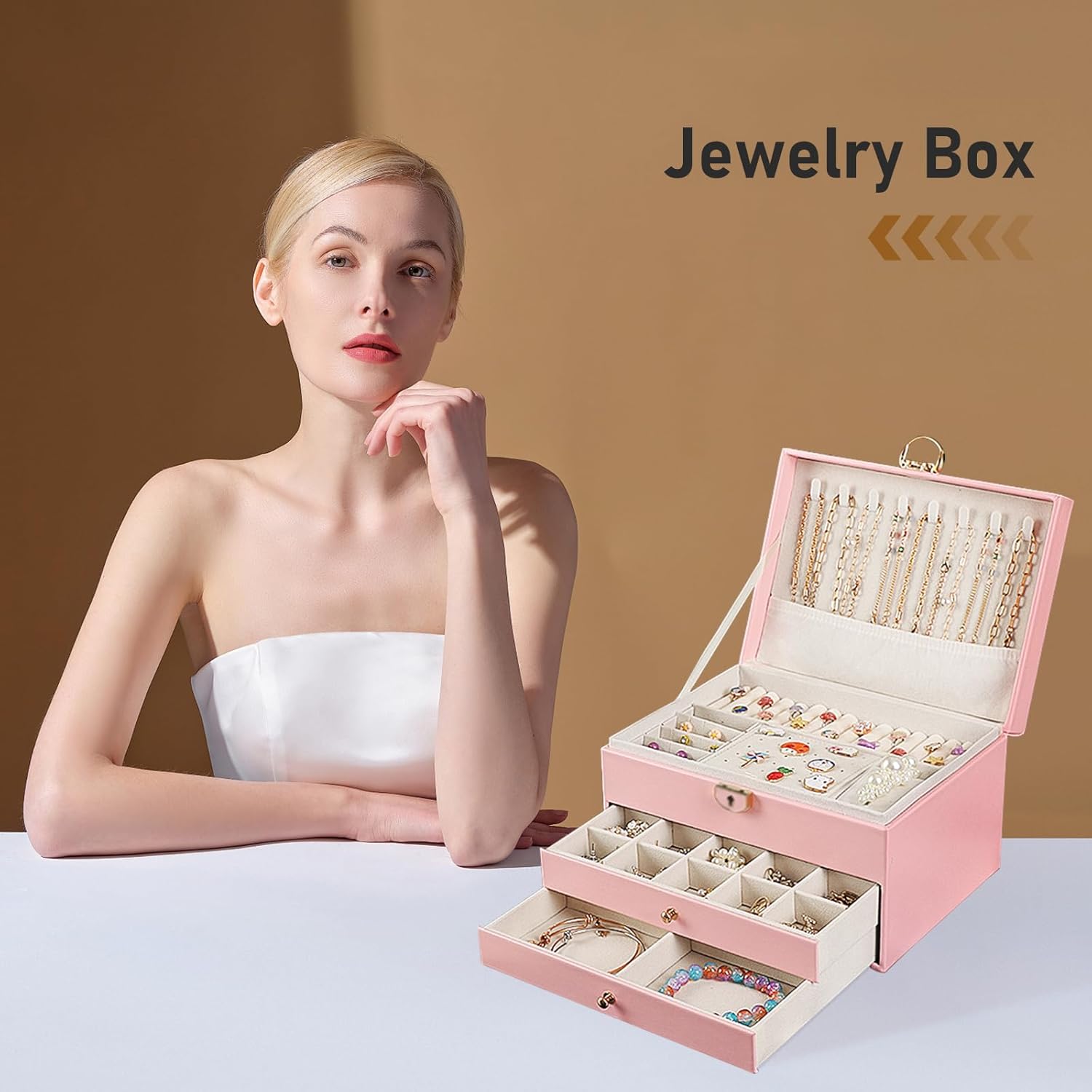 Jewelry Box for Women and Girls,3 Layer Large Jewelry Organizer With Removable Tray,Velvet Lined Jewelry Storage Case Pu Leather with Lock for Rings Earrings Necklace Bracelet Watch (Pink)