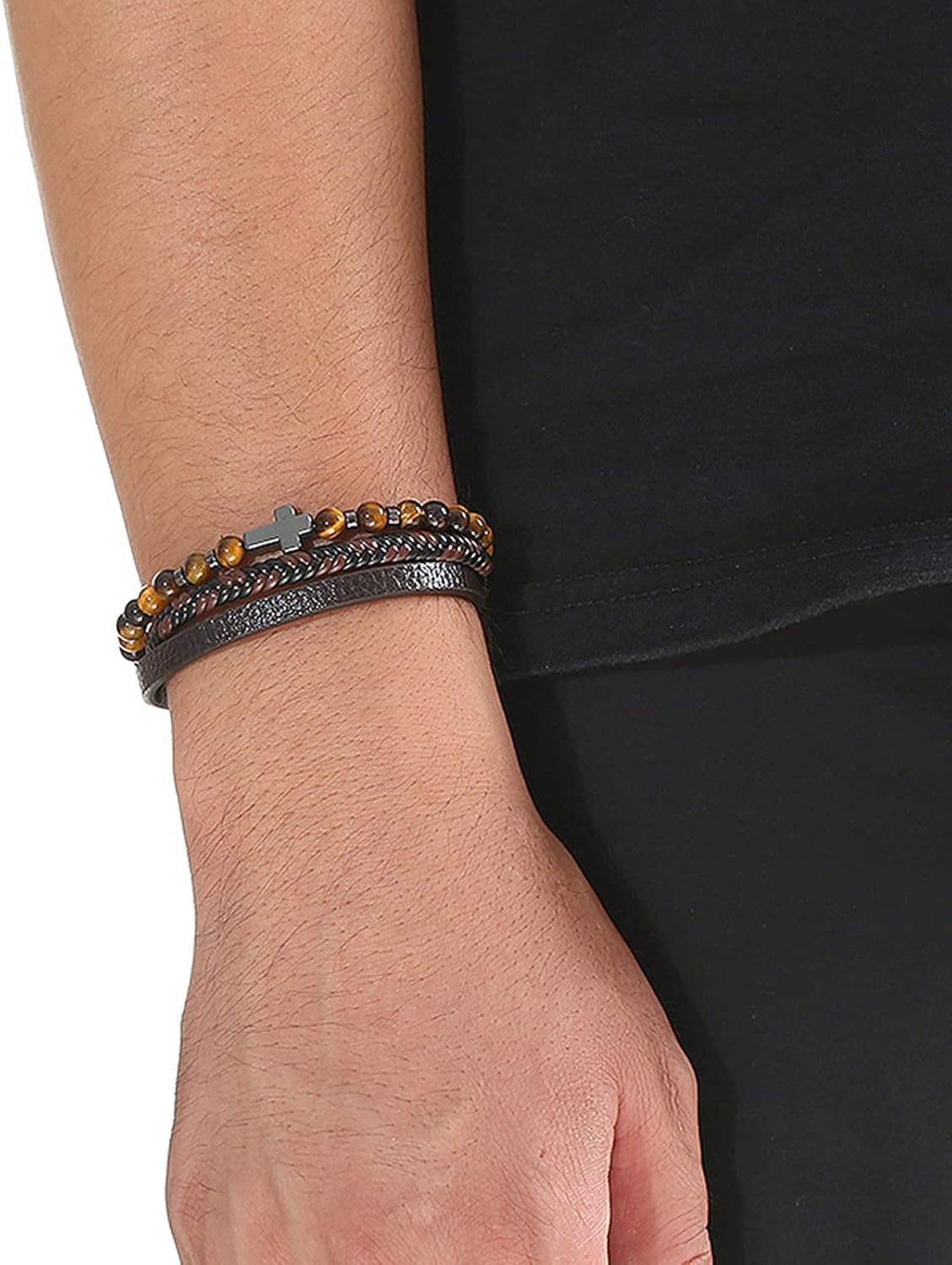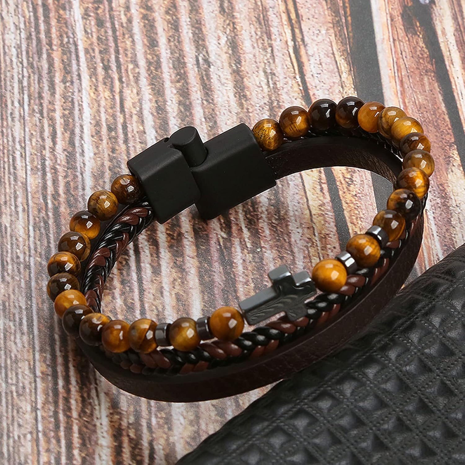 Be the first to review “Leather Bracelet for Men Cross Cuff Bracelet Magnetic Clasp Braided Bracelet Tiger Eye Leather Wristband Triple Protection Bracelet Jewelry Gift”