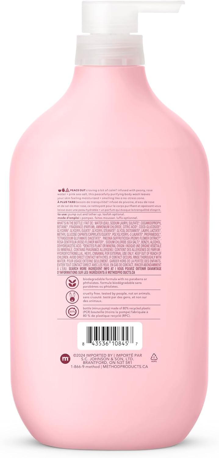 Method Pure Peace Body Wash, Relaxing Shower Gel and Body Soap Formulated with Peony, Rose Water, and Pink Sea Salt, 828 ml