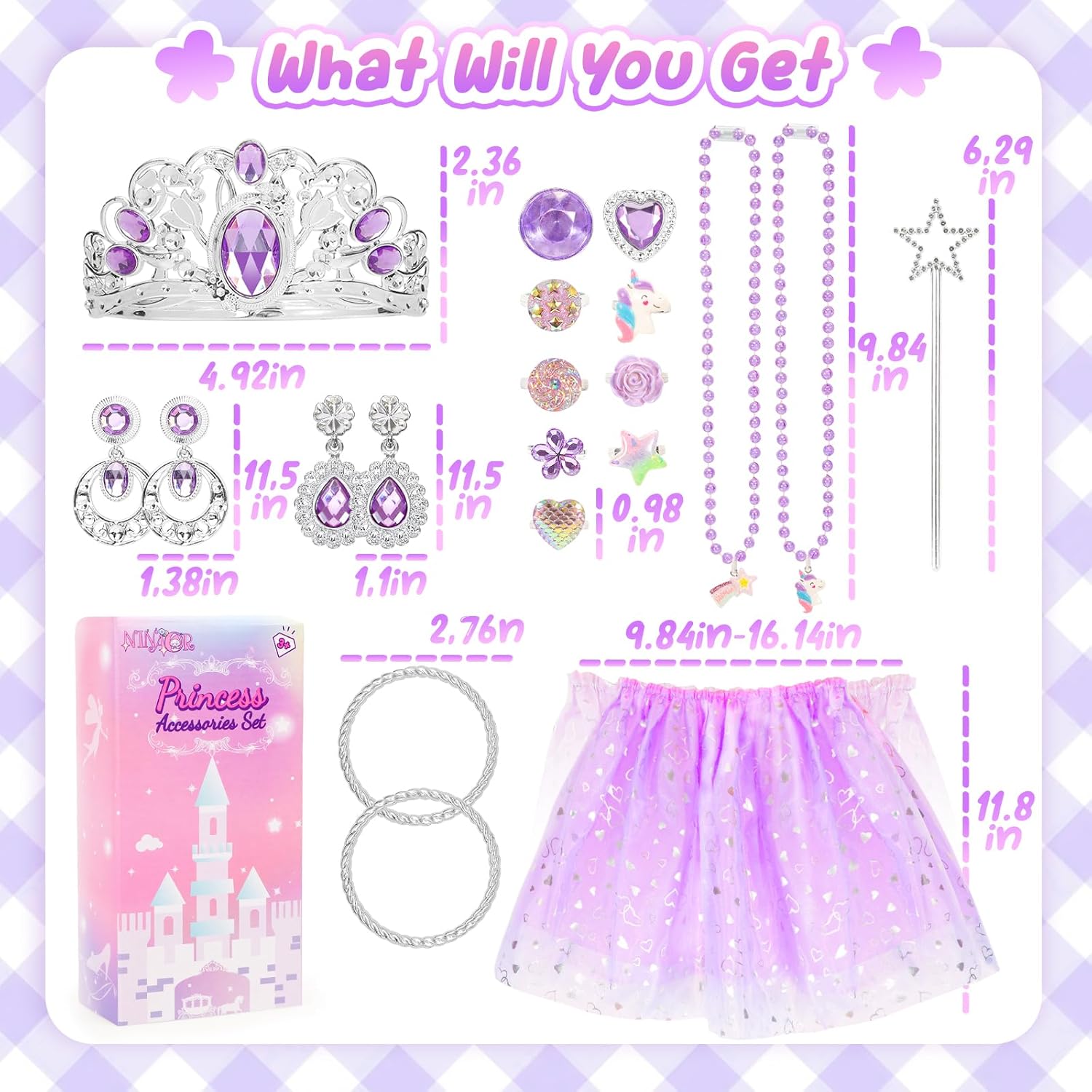 Princess Dress Up Set: NINAOR purple themed princess set contains the jewelry accessories and skirt needed to complete the little girl’s dress up as a princess, including 2 pairs of earrings, 1 skirt, 1 crown, 2 bracelets, 2 necklaces, 9 rings and 1 magic wand. Rich toy princess accessories for your child to wear and let her become a beautiful princess.