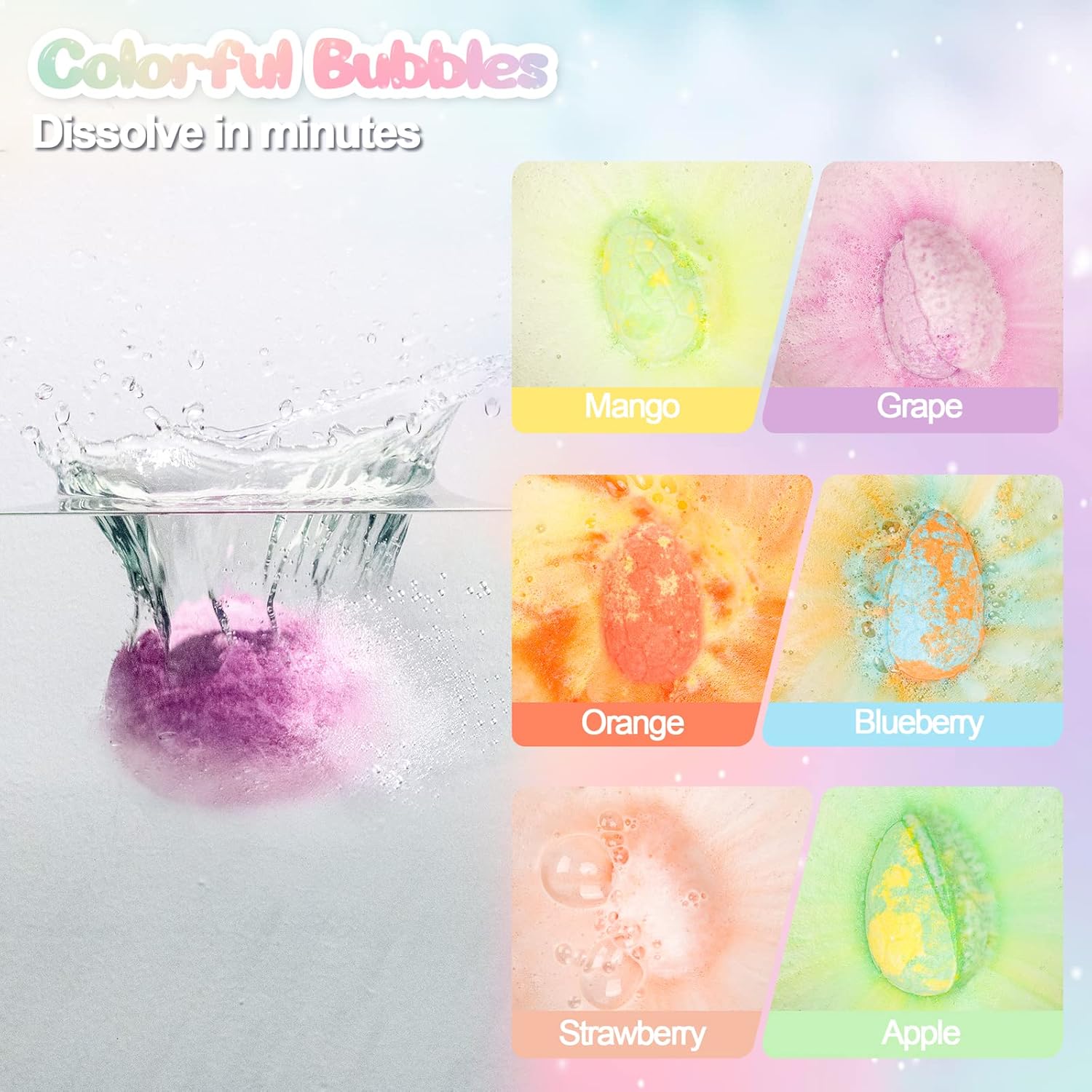 ❤【Natural Bath Bombs with 6 Fruit Scents】- 6 PCS handmade kids bath bombs made with organic shea butter and essential oils, use high quality ingredients that are safe for sensitive skin! These bath beads contains no artificial flavors or colors and are safe and gentle for kids. Pack of 6 assorted scents: Blueberry, Strawberry, Orange, Green Apple, Grape, Mango.