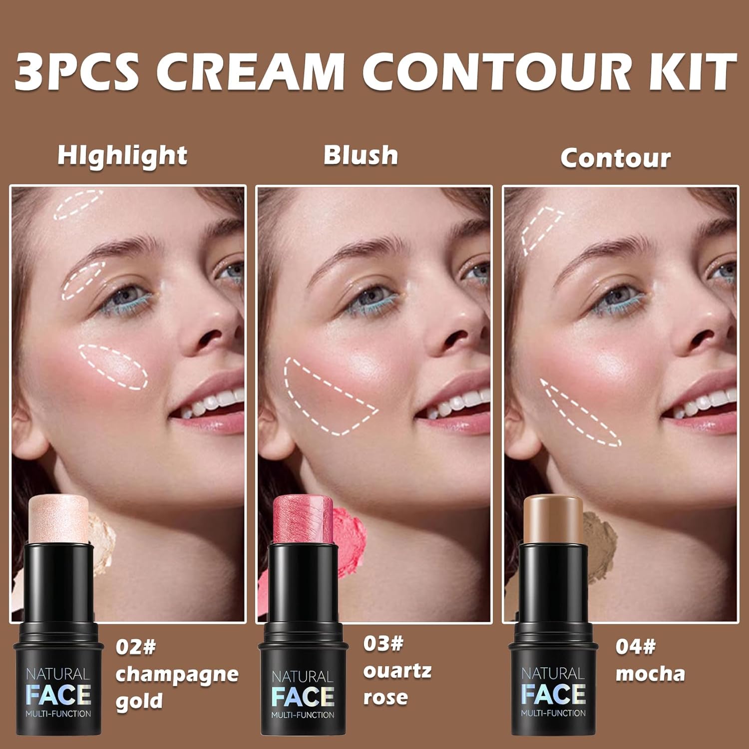 【Lightweight & Moisturizing】Texture of the cream contour stick is light and non-sticky.It has a light and smooth makeup feel,is gentle and comfortable,and is suitable for all skin types.Contains hydrating ingredients to nourish skin for a healthy,radiant complexion.
