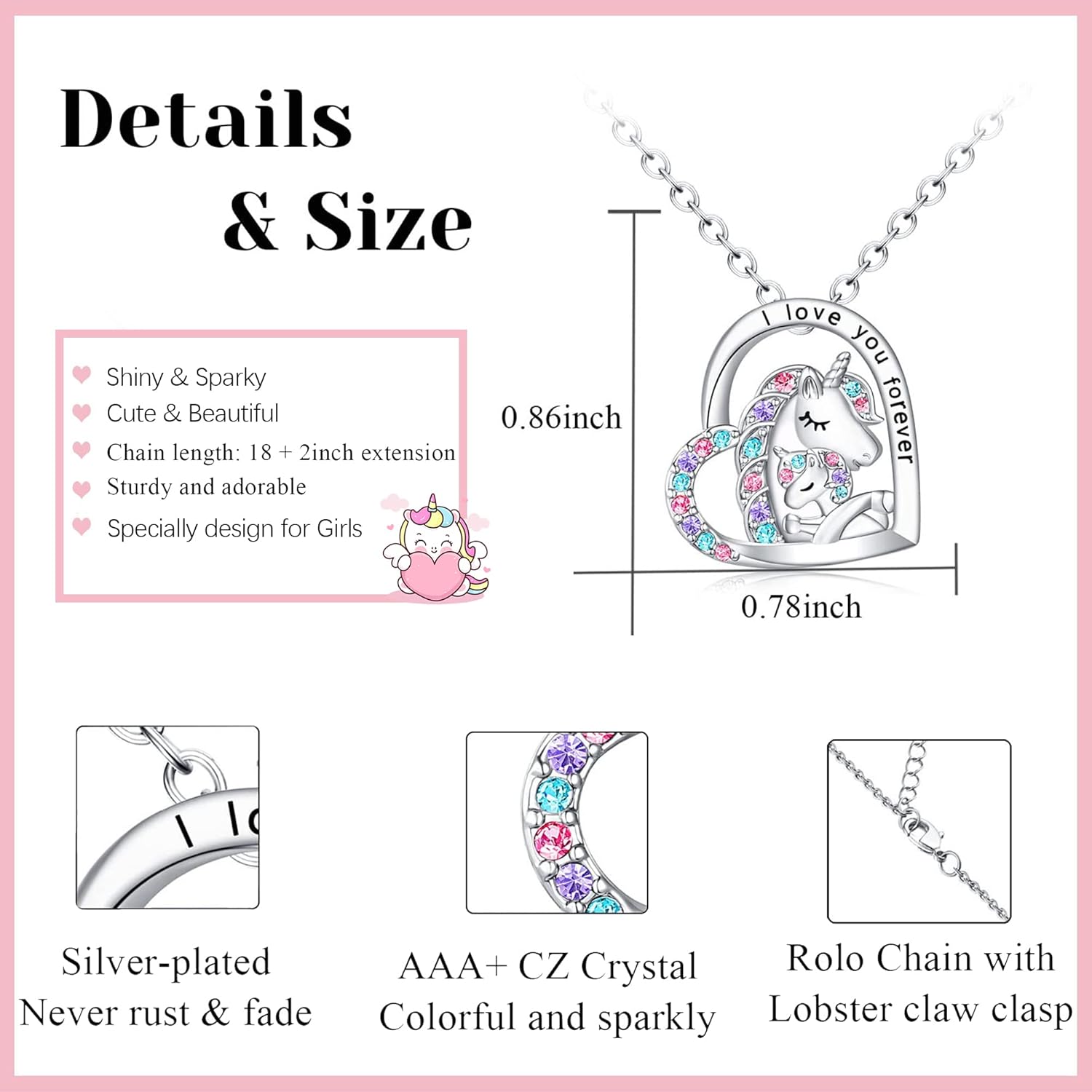 The unicorn necklace is decorated with colorful Cubic Zirconia crystals, that really catches the girls’ eyes.Made of silver-plated. No rust. No color changing.