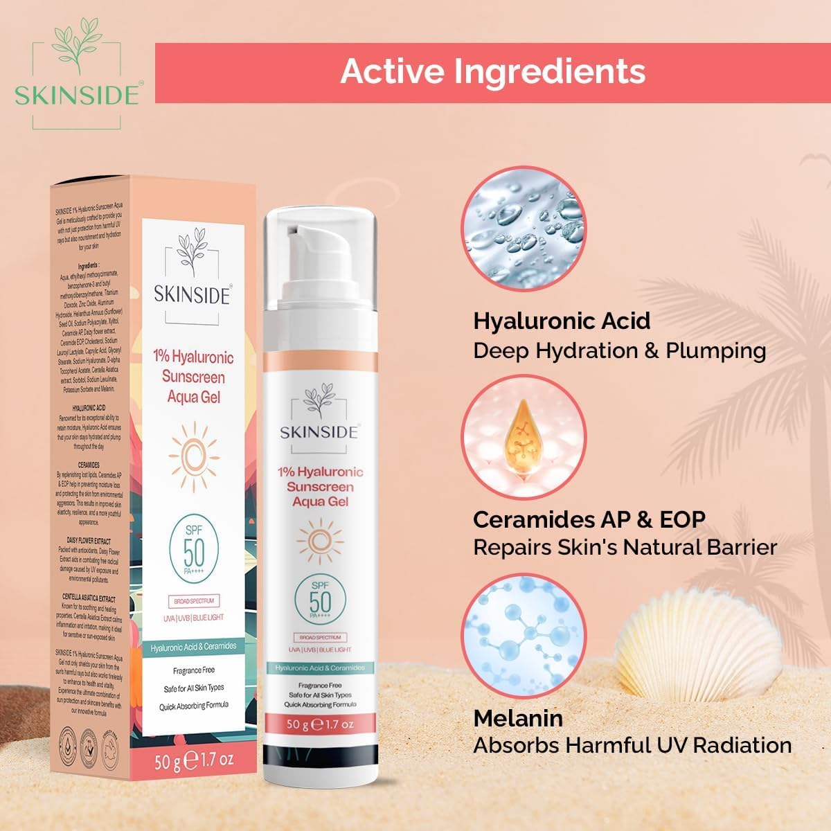 SkinSid’e 1% Hyaluronic Sunscreen Aqua Gel Ultra Light SPF 50 PA++++ | UVA UVB & Blue Light Protection | Zero White Cast | For All Skin Types | For Men & Women (50g)