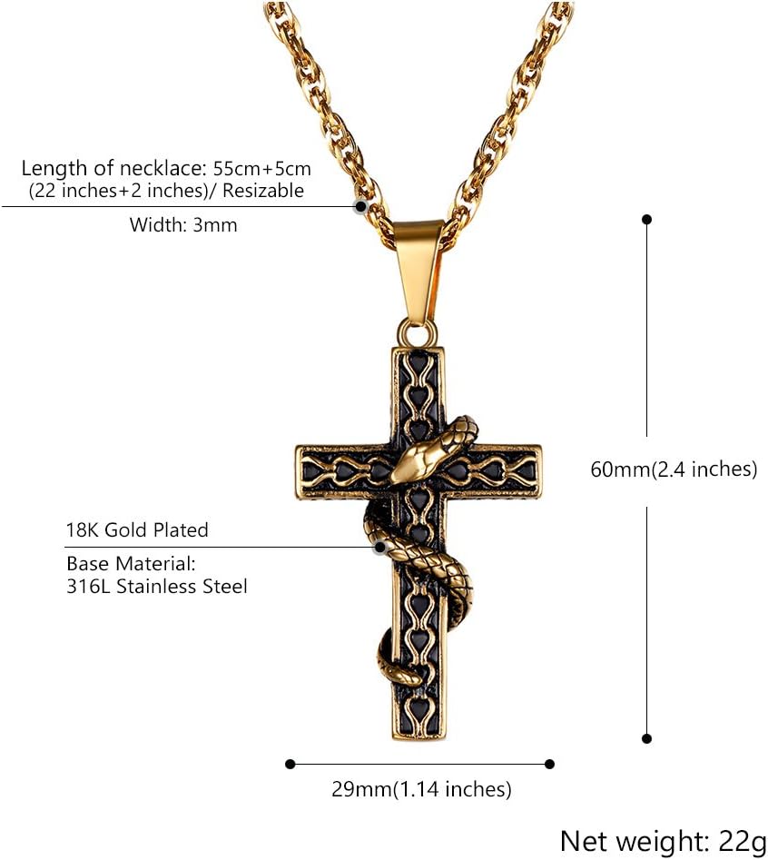 Snake Cross Pendant Men Gothic Religious Necklaces, 316L Stainless Steel Men 18k Gold/Black Gun Plated Christian Jewelry