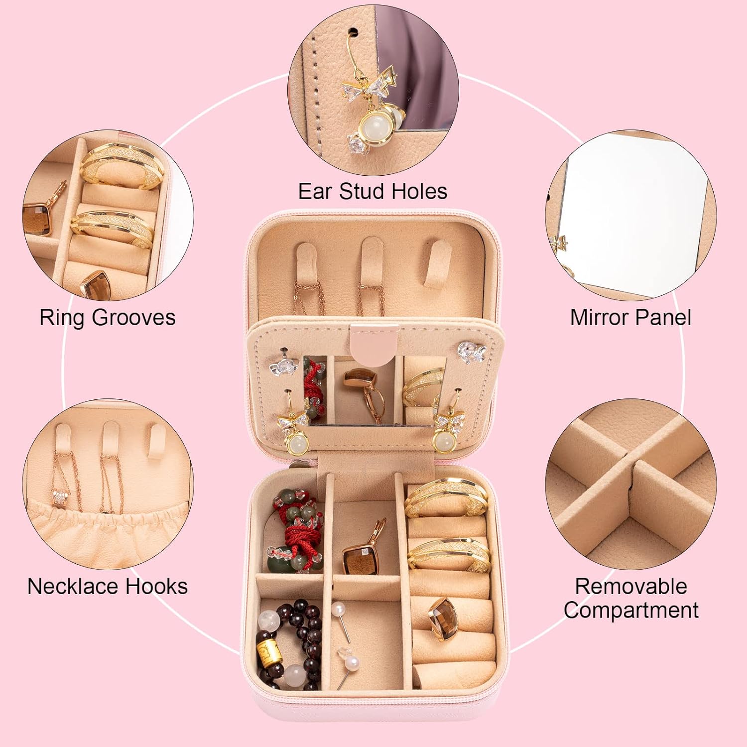 Ingenious Design: This mini travel jewelry box comes with 3 necklace hooks, 1 elastic pocket, 4 removable compartments and 6 slotted roll earring compartments to separate and protect your jewelry