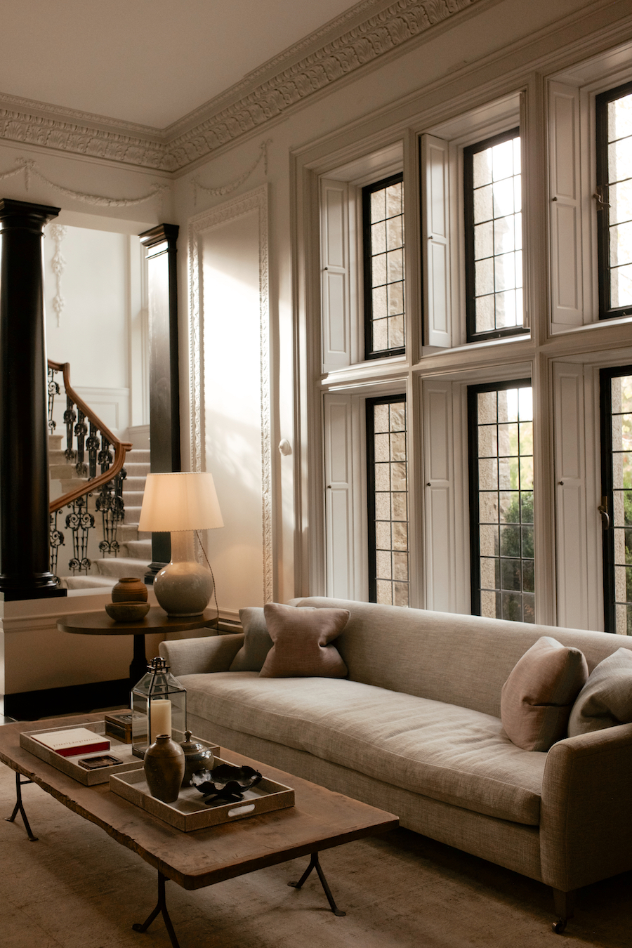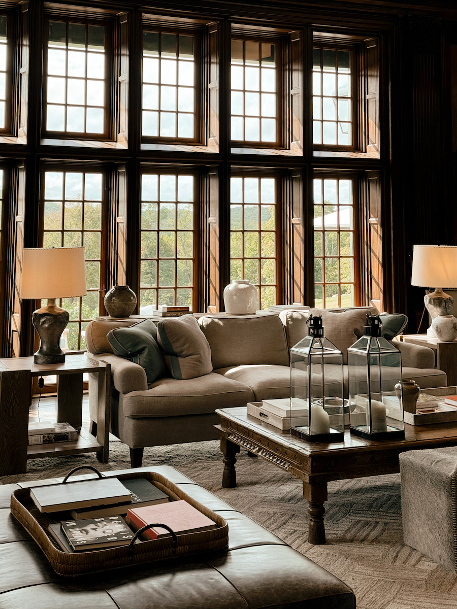 As evident from the photos, the history of this building is undeniable—the original molding, grand wrought iron staircase, and those stunning historic floors already set a breathtaking stage. But when Steven Gambrel, the interior designer for the newly restored Ranch Hudson Valley, stepped in, things reached a whole new level. Gambrel brought his signature approach of blending timeless elegance with modern flair to each room. The entryway and grand staircase immediately impress, while the grand room, now an exercise space, features a hearth fireplace, coffered ceilings, and massive windows that let in all that glorious natural light. The solarium-turned-dining room creates a perfect spot for farm-to-table meals, and the living room with its cozy fireplace and board games is the ultimate invitation to unwind and stay a while. Gambrel’s ability to mix the building’s historic bones with fresh, inviting decor makes this retreat a place where history and wellness harmonize beautifully!